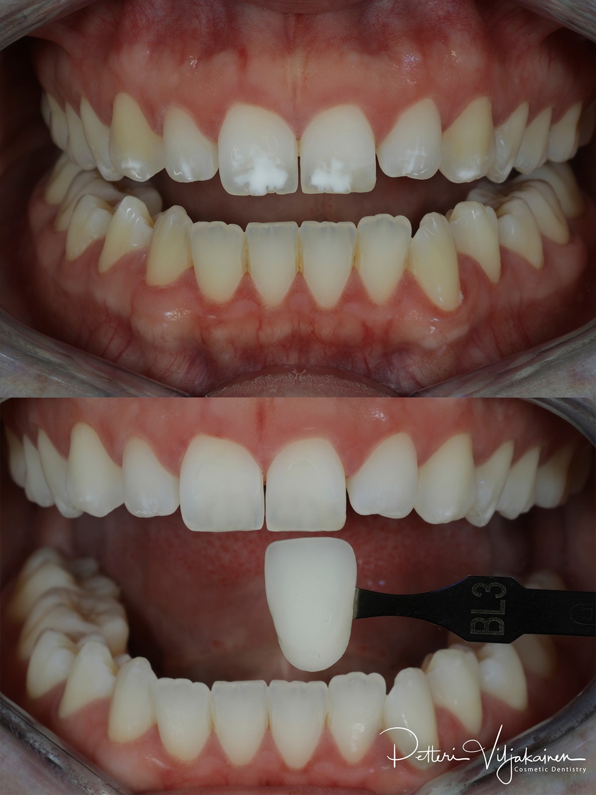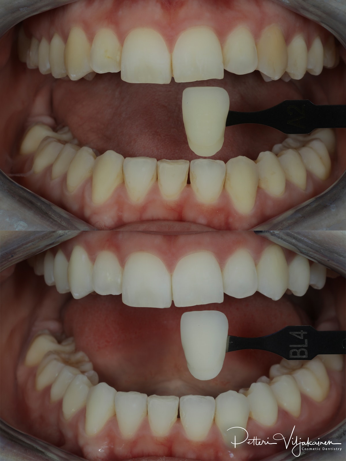 Alla olevat ennen / jälkeen -kuvat on otettu polarisaatiofiltterillä, jotta hampaiden väriero näkyy paremmin. Hampaiden lähtösävy on nuorilla hampaistaan huolta pitävillä aikuisilla usein välillä A1 - A2. Värikartassa sävyt on järjestetty kirkkauden mukaan.