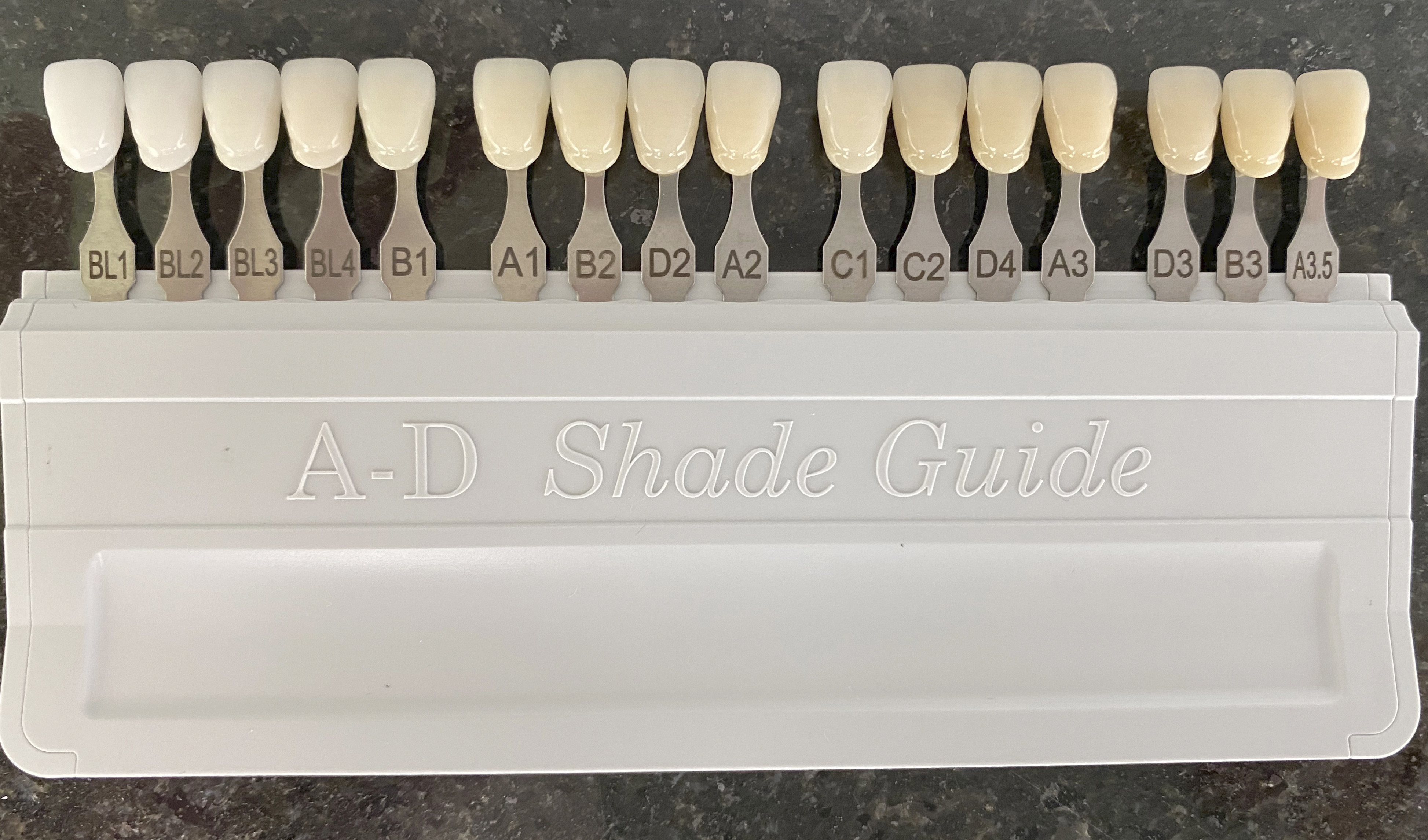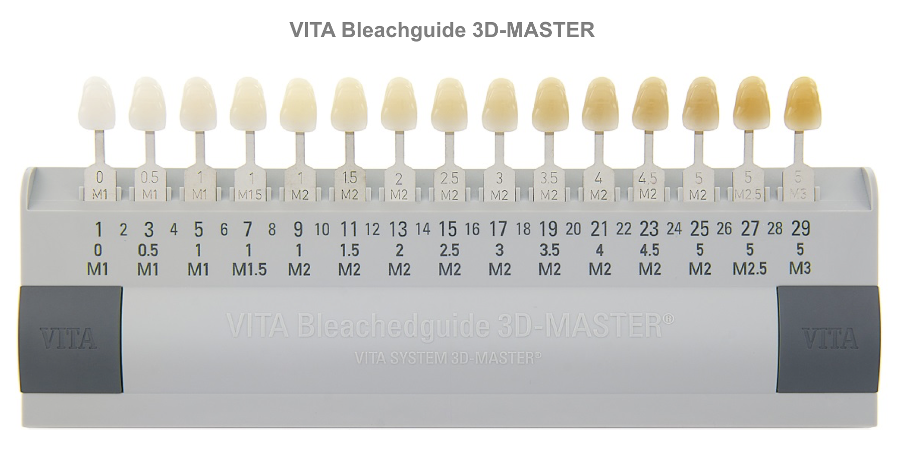 Yleisesti suuhygienisteillä käytössä oleva väriskaala jossa värisävyt on järjestetty vaaleuden perusteella. Jos olet käynyt suuhygienistillä valkaisussa ja sait kuulla saaneesi esimerkiksi viisi astetta valeammat hampaat, niin tämä oli todennäköisesti käytetty väriskaala. Hammaslääkärin kannalta skaala on vähän epäkäytännöllinen, mutta hyvä tapa näyttää valkaisulla saavutettu lopputulos. 3D-masterin värisävy M1O vastaa ylemmän väriskaalan sävyä BL2.