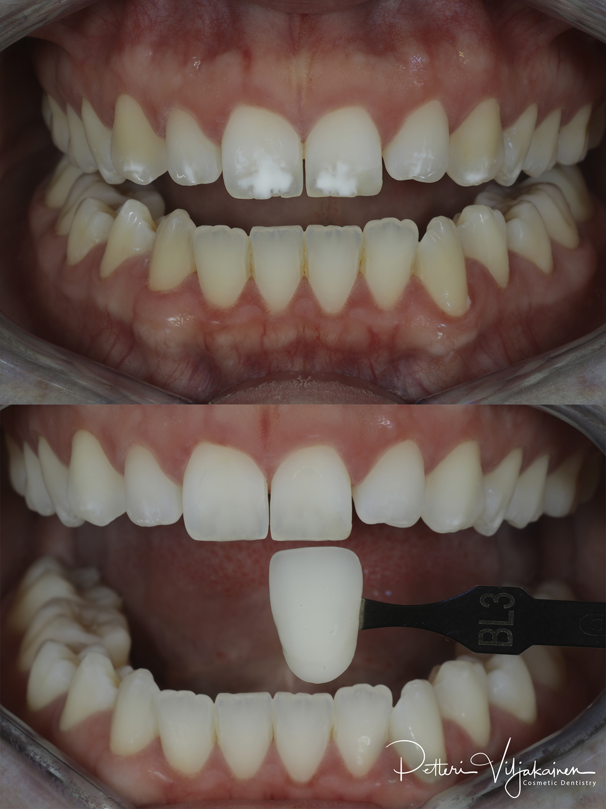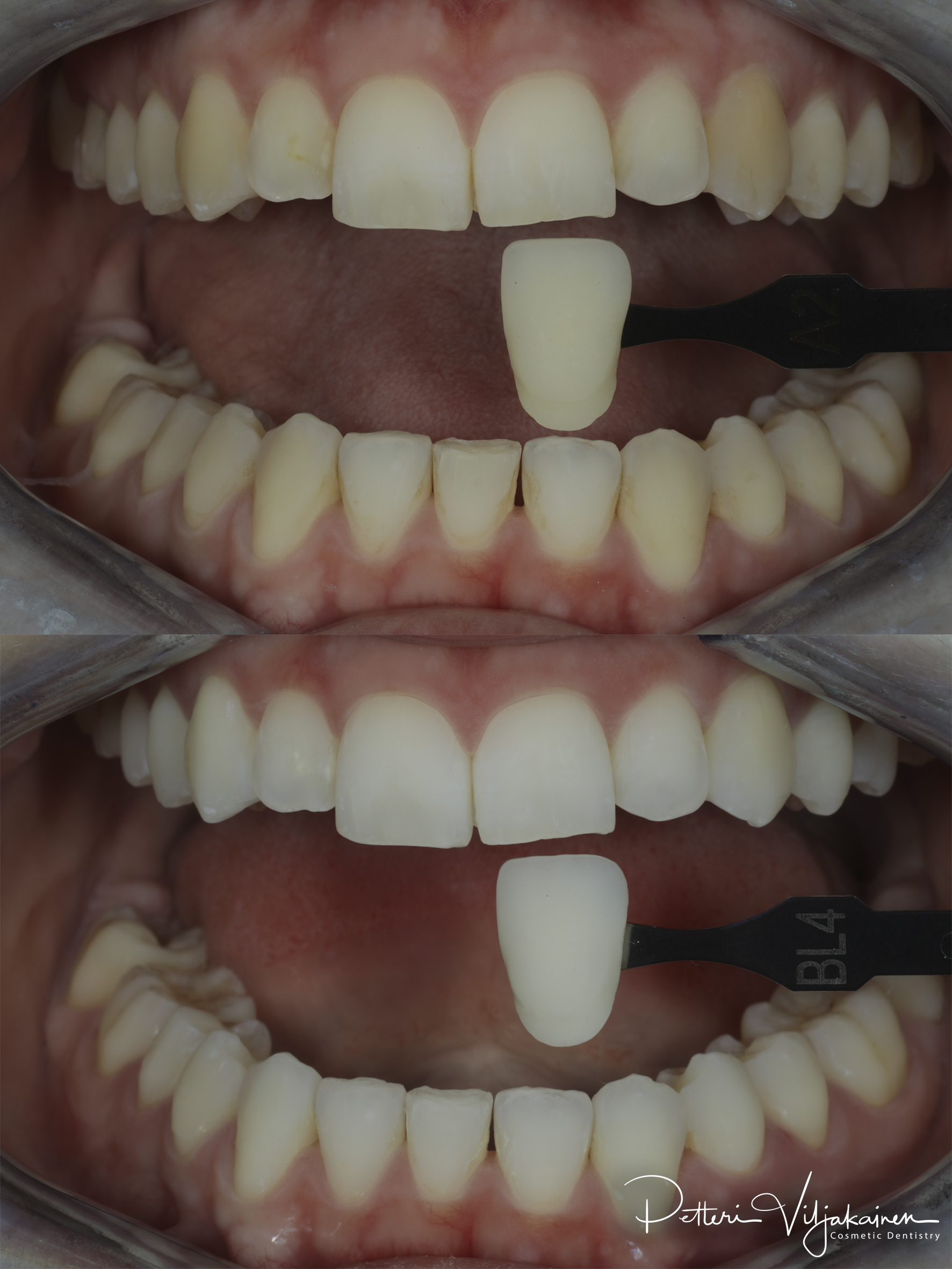 Alla olevat ennen / jälkeen -kuvat on otettu polarisaatiofiltterillä, jotta hampaiden väriero näkyy paremmin. Hampaiden lähtösävy on nuorilla hampaistaan huolta pitävillä aikuisilla usein välillä A1 - A2. Värikartassa sävyt on järjestetty kirkkauden mukaan.