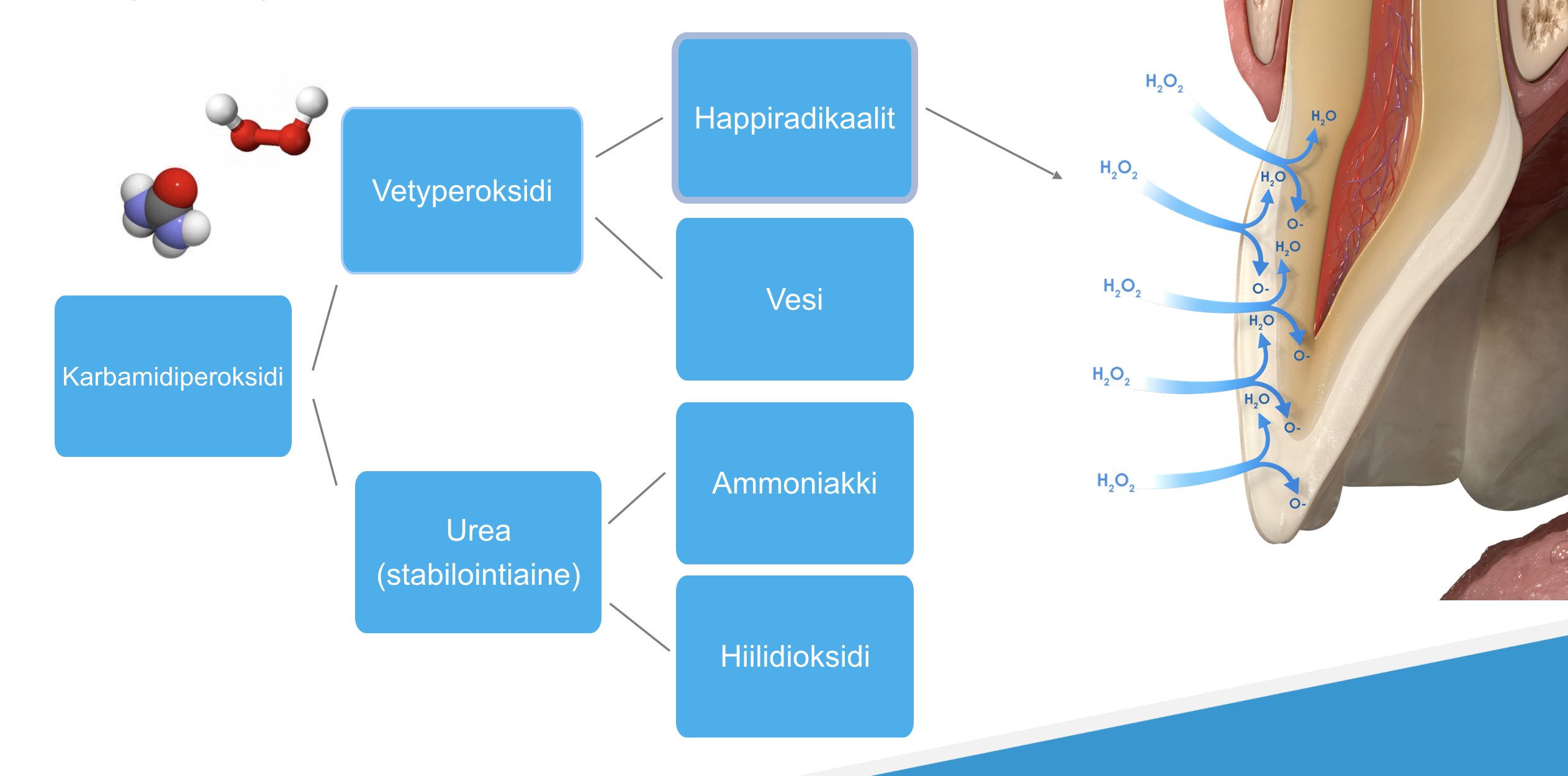 Vetyperoksidia sisältävät valkaisuaineet, joutuessaan kontaktiin hampaan kanssa, hajoavat vedeksi, hapeksi sekä vapaiksi happiradikaaleiksi. Valkaisuaineiden toiminta perustuu näiden happi -ionien toimintaan. Ne poistavat värjäytymiä hajottamalla (hapettamalla) niitä koossa pitäviä sidoksia. Mitä pienempiä värjäytyneet värilliset molekyylit ovat, sitä enemmän omaa hampaan vaaleaa väriä heijastuu takaisin hampaasta.
