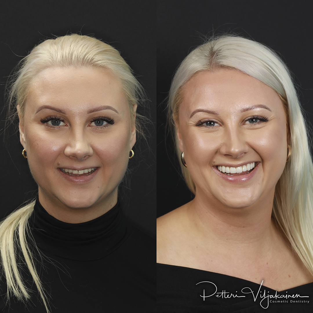 Yhdistelmämuovilaminaatit kymmenessä ylähampaassa. Hoito toteutettiin täysin ilman omien hampaiden poraamista. Alahampaat valkaistiin 2 viikon kotivalkaisulla.